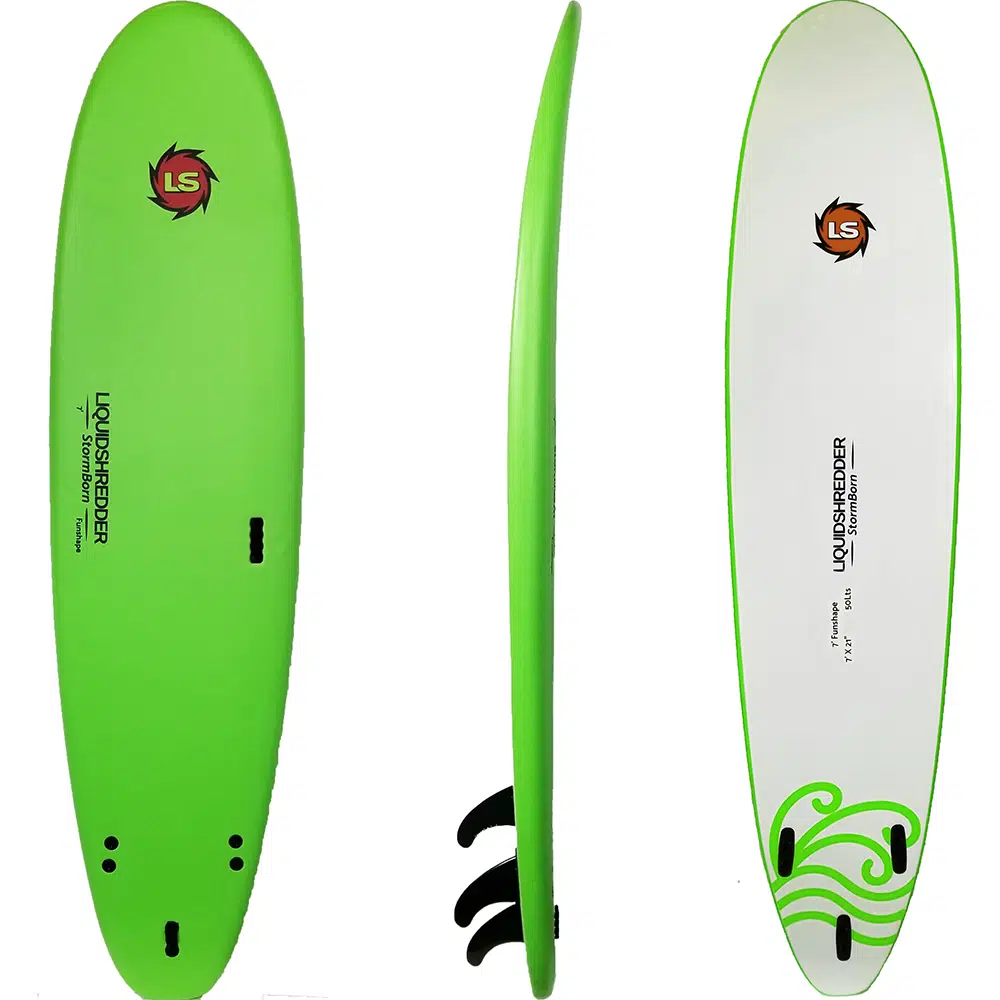 Liquid Shredder Storm Born 7 feet surfboard is a high-performance Ripper foam surfboard. The funshape surfboard style of the Storm Born with FCS thruster fins add a RAD element of fun to your wave riding. Liquid Shredder perfected the Soft Top funshape thruster ssurfboard with a rounded surfboard’s nose shape, medium rocker, and a squash tail.